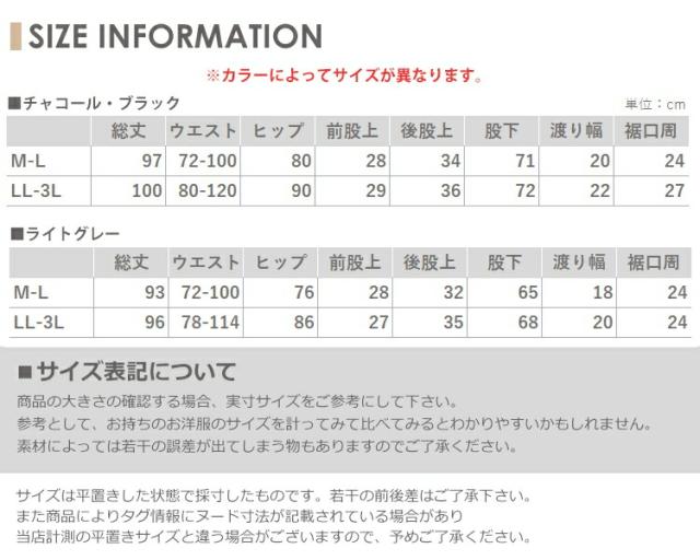 LL-3L:総丈100 W80-120 H90 前股上29 後股上36 股下72 渡り幅22 裾口周27