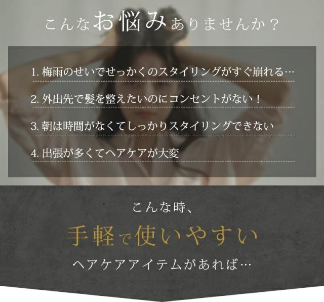 ・高品質リチウムイオン4000mah電池を内蔵し、付属のUSBケーブルで充電しておけば、いつでもどこでもヘアセットができる充電式コードレスタイプです。