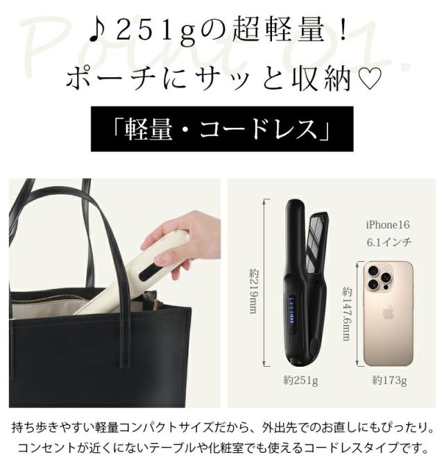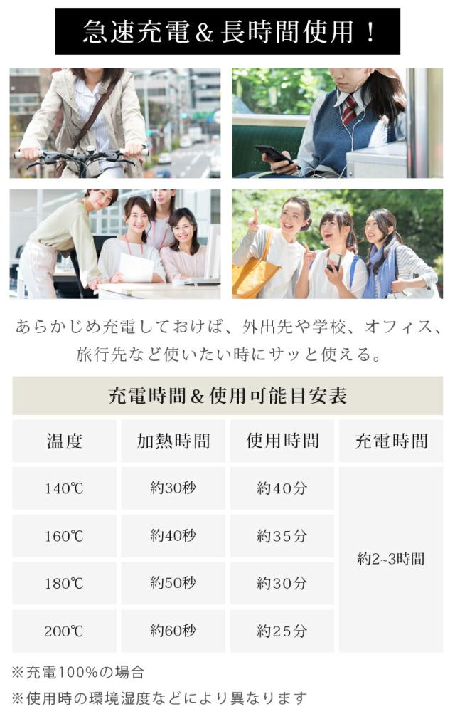 ・1回のフル充電で、約40分間使用できます。コンパクト&軽量だから旅行や出張などに1つあると便利!バッグ収まるサイズ感だから常に持ち運びができる便利なアイテムです。