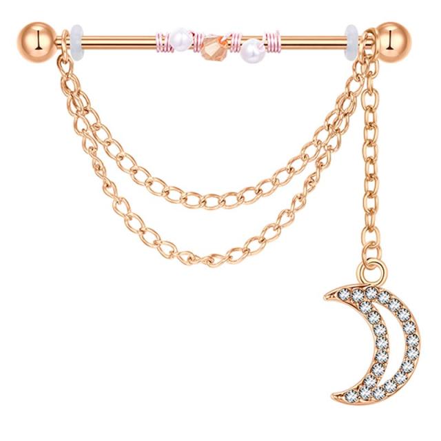ピンクゴールドメッキした長いロングタイプの14ゲージのストレートバーベルにイミテーションの真珠パールとビーズをセットし2連の鎖と大きな三日月が揺れるインダストリアル用ボディピアス。