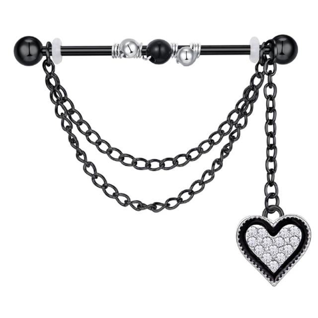 かっこいいシックなブラックハートにセットしたキラキラのクリスタルのジルコニアが上品にきまるメガバーベル。ストレートバーベルの素材はステンレス、チャームやチェーンの素材はメタルとなります。優雅に揺れる上品なチャームタイプのインダストリアルは男性からも女性からも人気のボディーピアス。耳の軟骨と軟骨をつなぐ架け橋のようなロングバーベルは、彼氏彼女でお揃いでコーデしても可愛いボディーピアス。高級感もあるので、結婚式やウエディングパーティーにもぴったりのチャームインダストリアルボディピアス。メンズでもレディースでも使えるのでペアルックやプレゼントにもおすすめです。サプライズギフトにいかが?