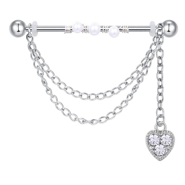 長いロングタイプの14ゲージのストレートバーベルにイミテーションの真珠パールをセットし2連の鎖とキラキラのハートのジュエルチャームが揺れるインダストリアル用ボディピアス。