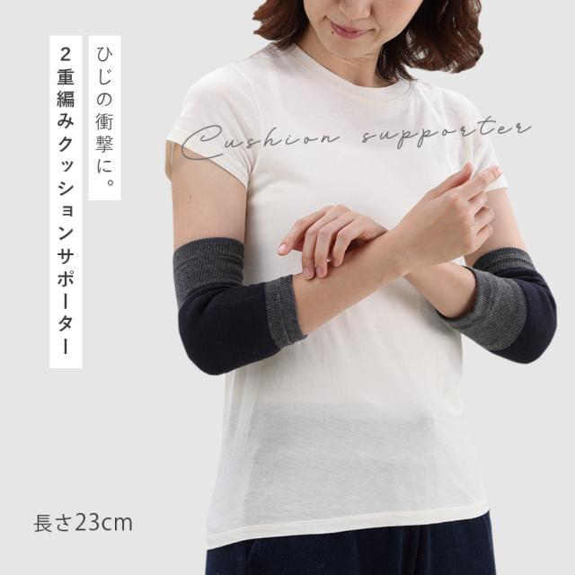 長時間のデスクワーク、スマホの使い過ぎで肘に痛みや違和感がある方におすすめ。2重編みの衝撃吸収タイプの肘用クッションサポーター。
