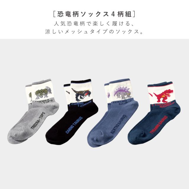 靴下,くつした,くつ下,ソックス,4足組,セット,春夏,春,夏,メッシュ,メッシュ編み,通気性,蒸れない,ムレない,ムレにくい,暑い,季節,涼しい,爽やか,さわやか,さらっとしている,さらさら,サラサラ,汗,べたつかない,通気性,動きやすい,履きやすい,つま先,かかと,補強,丈夫,薄手,薄い,キッズ,子供,子ども,こども,ジュニア,男の子,男子,ボーイズ,クルー丈,ショート丈,日本製,名前,書ける,恐竜,恐竜柄,グッズ,ティラノサウルス,トリケラトプス,カルノタウルス,ケントロサウルス,恐竜好き,やわらかい,柔らかい,ソフト,肌触り,ソフトタッチ,快適,心地よい,おしゃれ,かわいい,お洒落,オシャレ,可愛い,ベーシック,定番,ヘビロテ,ファッション,普段使い,デイリーユース,おすすめ,素材,生地,気持ちいい,幼児,園児,保育園,幼稚園,通園,入学,通学,育児,子育て,ジュニア,小学校,小学生,通学,家族,ファミリー,お出かけ,外出,旅行,洗い替え,カジュアル,ユニーク,小物,コーディネート,16cm,16センチ,17cm,17センチ,18cm,18センチ,19cm,19センチ,20cm,20センチ,21cm,21センチ,22cm,22センチ,23cm,23センチ,24cm,24センチ,16-20cm,20-24cm