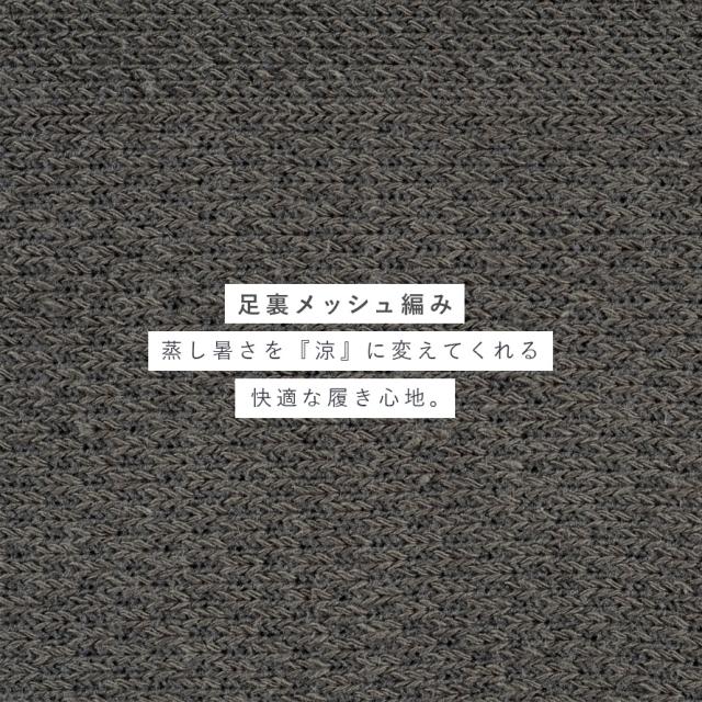 麻混(約14%)に加え、足裏は風が通るメッシュ編みなので、ムレにくく清涼感があります。