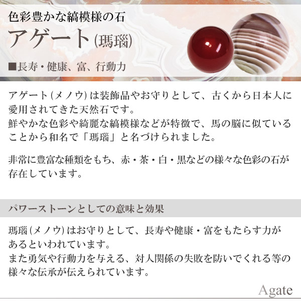 瑪瑙(メノウ)はお守りとして、長寿や健康・富をもたらす力があるといわれています。