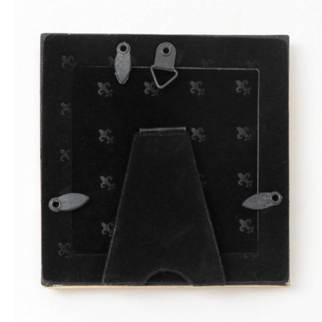 フォトスタンドとして立てて置くだけでなく、壁掛け用フックが付いているので壁にも取り付けられます。背面の素材はベルベット調で高級感があります。