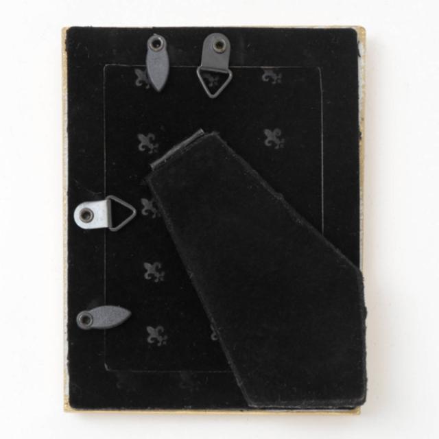 フォトスタンドとして立てて置くだけでなく、壁掛け用フックが付いているので壁にも取り付けられます。背面の素材はベルベット調で高級感があります。