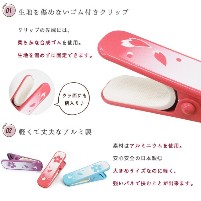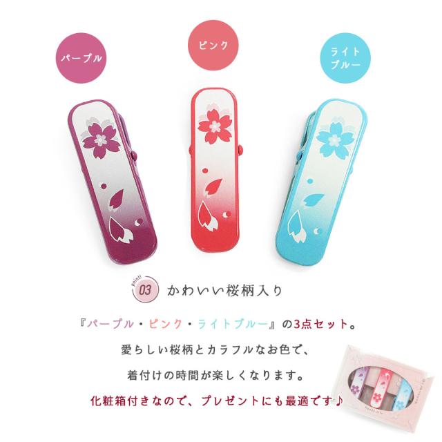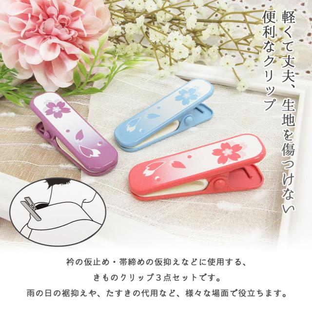 【1セットまでメール便送料無料】きものクリップ 3点セット 大 着付け小物 和装 日本製 和柄 衿留め 襟 たすき 留め 裾抑え 仮止め 便利 お洒落 桜 花 赤 水色 緑 紫 ライトブルー パープル ピンク 雨 着物 浴衣 襦袢 帯 ハンディクリップ