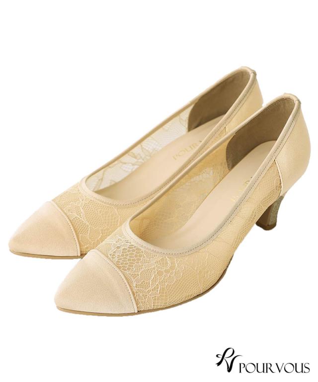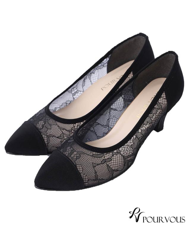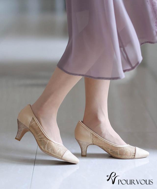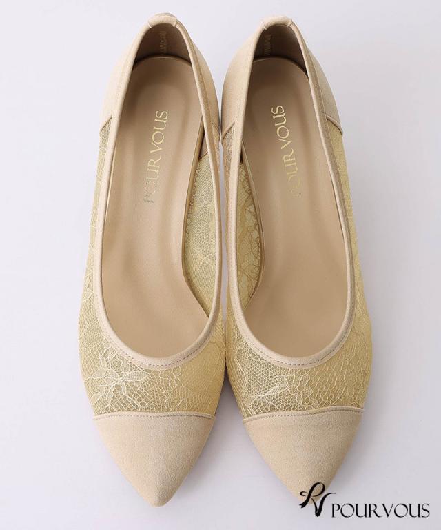 程よい透け感のレースが可愛いポインテッドトゥパンプス。