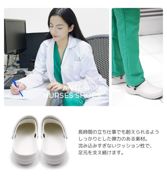 穴の無いデザインで足全体包み込み、液体や汚れから足を守ります。しっかりとした弾力と程よいクッション性で長時間の立ち仕事や歩くお仕事の疲労を軽減。