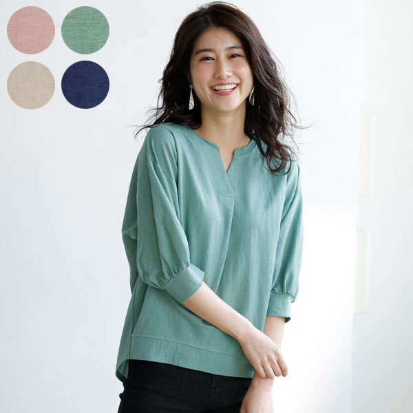 前後差のある着丈でお尻まわりをカバー。そして、ドルマン袖から裾にかけてのデザインがお腹まわりを目立たせません。キーネック仕様で首まわりがすっきり見えるのも嬉しいポイントです。カラーはピンクベージュ、グリーン、モカベージュ、ネイビーの4色からお選びいただけます。