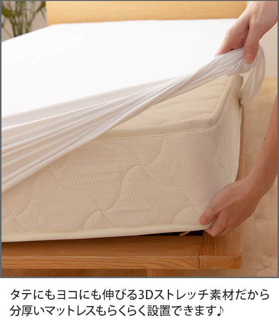ニット素材の柔らかい質感のボックスシーツです!タテにもヨコにも伸びる3Dストレッチ素材だから分厚いマットレスもらくらく設置できます♪