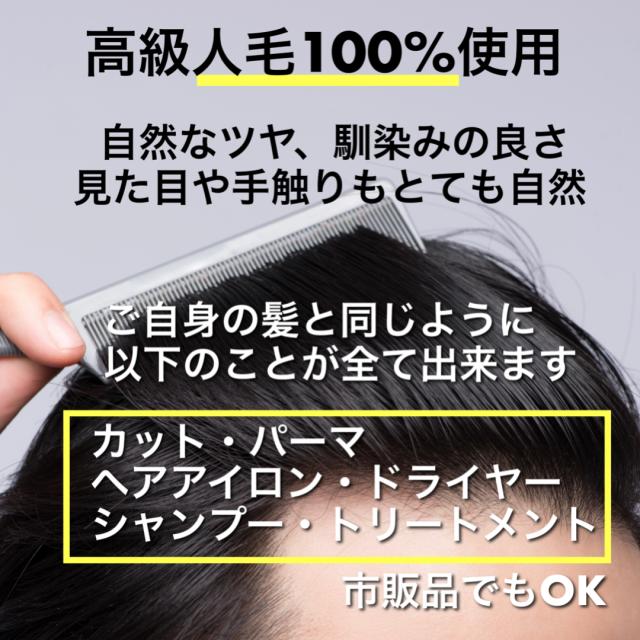 | 特徴2 | 高級人毛100%の為、ヘアアイロン、ヘアカット、シャンプーも使用可能 |