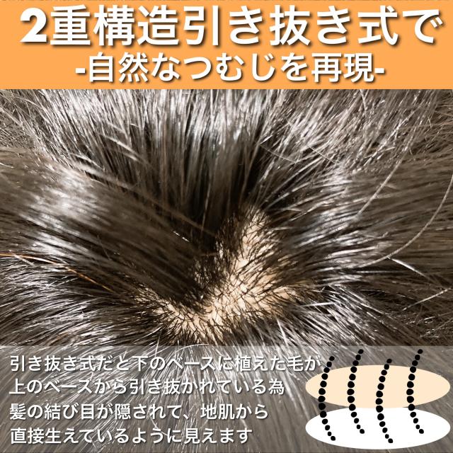 | 特徴1 | 自然なつむじO型つむじ植毛方法にもこだわり、二重構造&引き抜き式を採用。 |