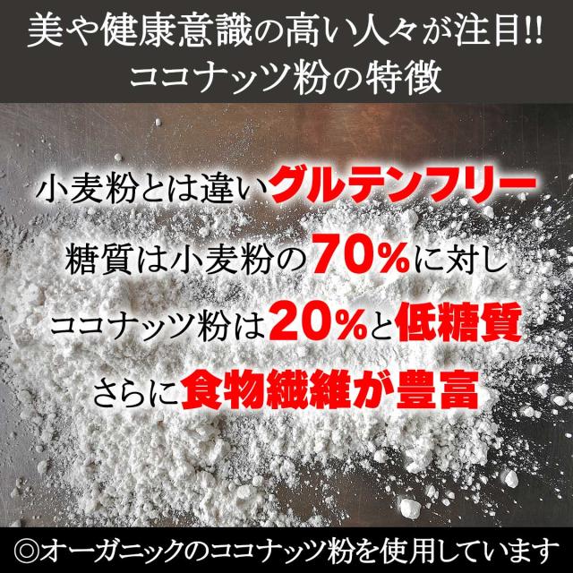 お子様からご年配の方まで、ココナツの芳醇な香りと甘みが広がるもっちり美味しいパンケーキミックスをお楽しみください。ドーナツ、クッキー、マフィン等のおやつ・お菓子作りにもオススメです。