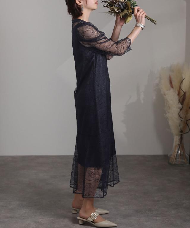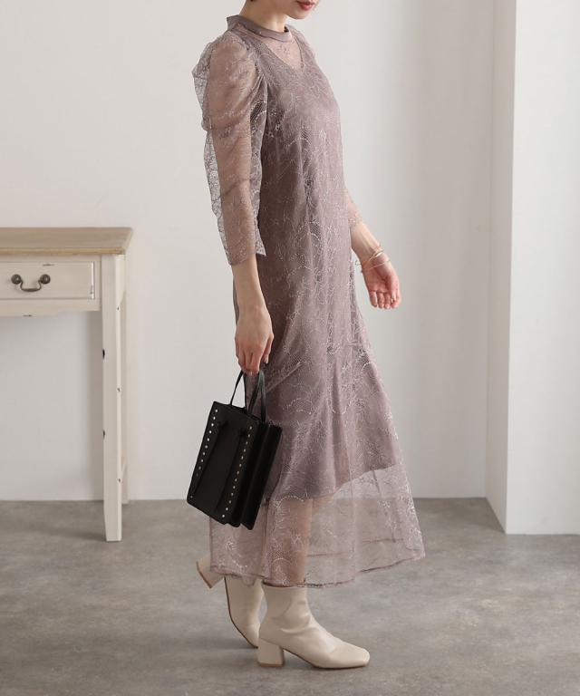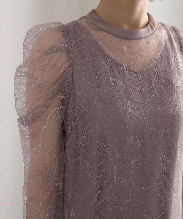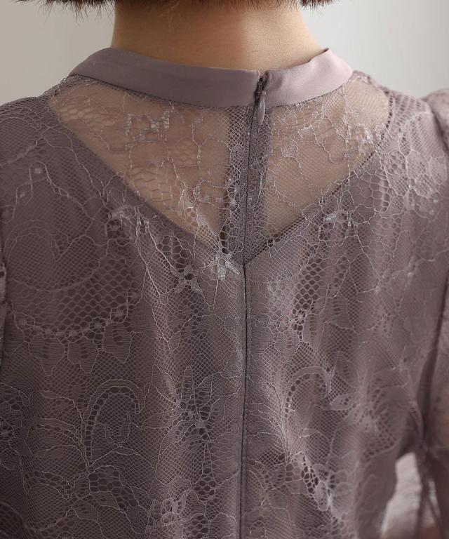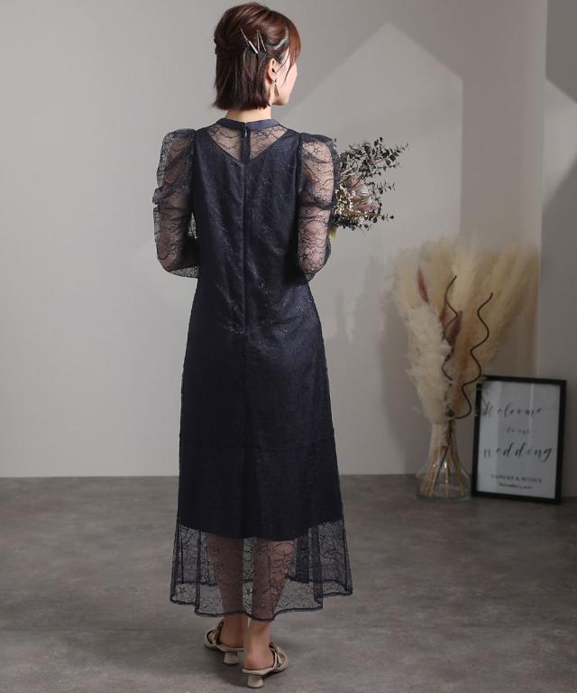 トレンドのパワーショルダーとデコルテの透け感が華やかなデザイン。