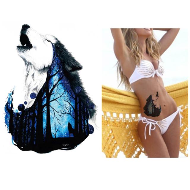 大きいサイズのカラフルな遠吠えする森の中の狼(オオカミ/ウルフ)をデザインした水で貼るフェイクタトゥーステッカー。