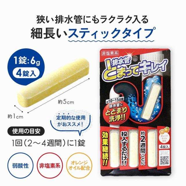 排水管とまってキレイ 排水管洗浄剤 スティック状 4錠入り オレンジオイル配合 排水溝 排水口 洗浄 つまり 掃除 ぬめり取り アイメディア 日本製