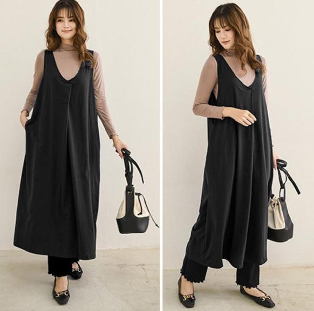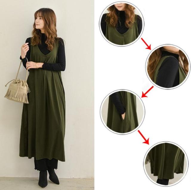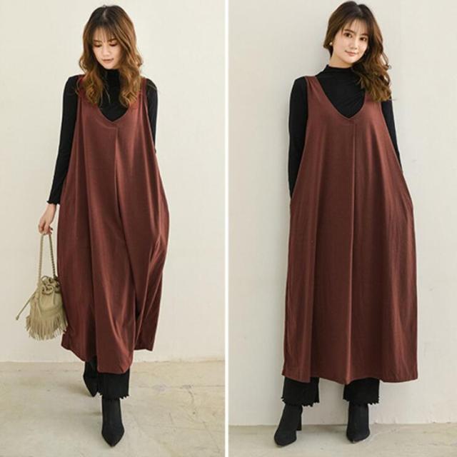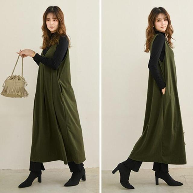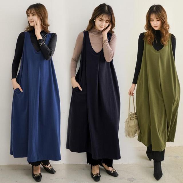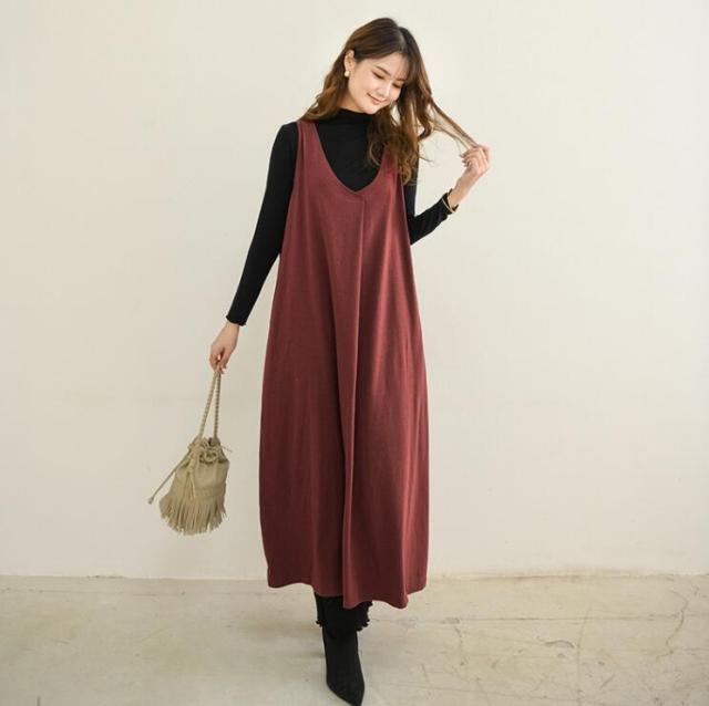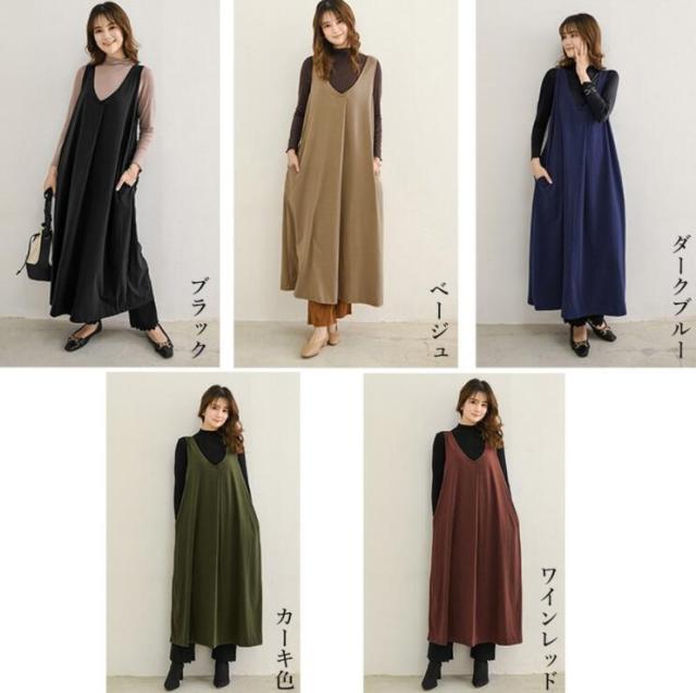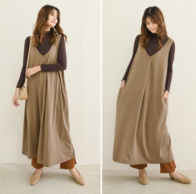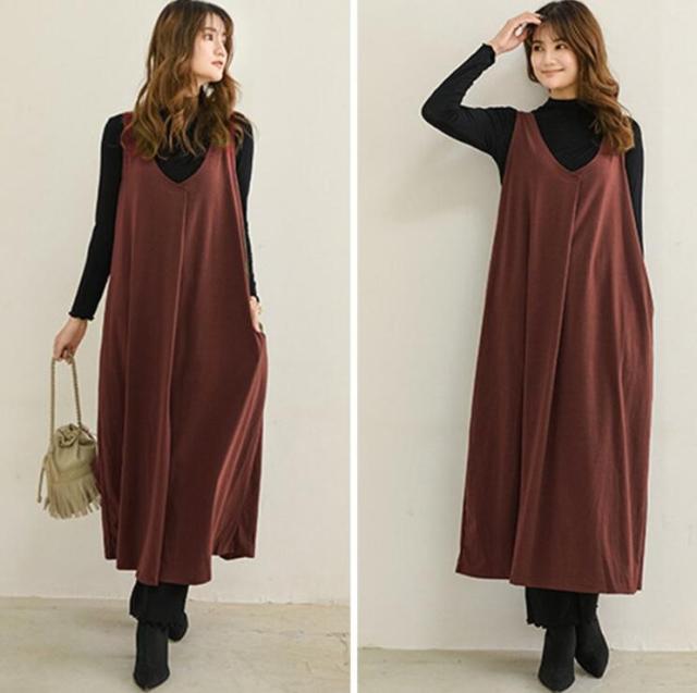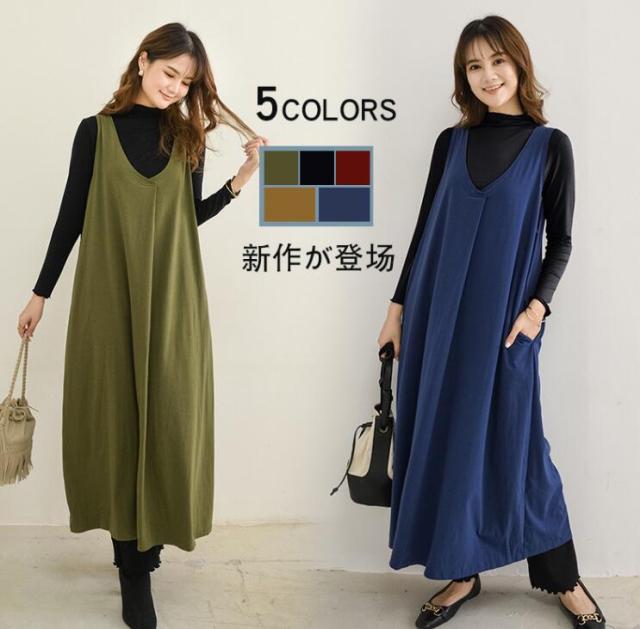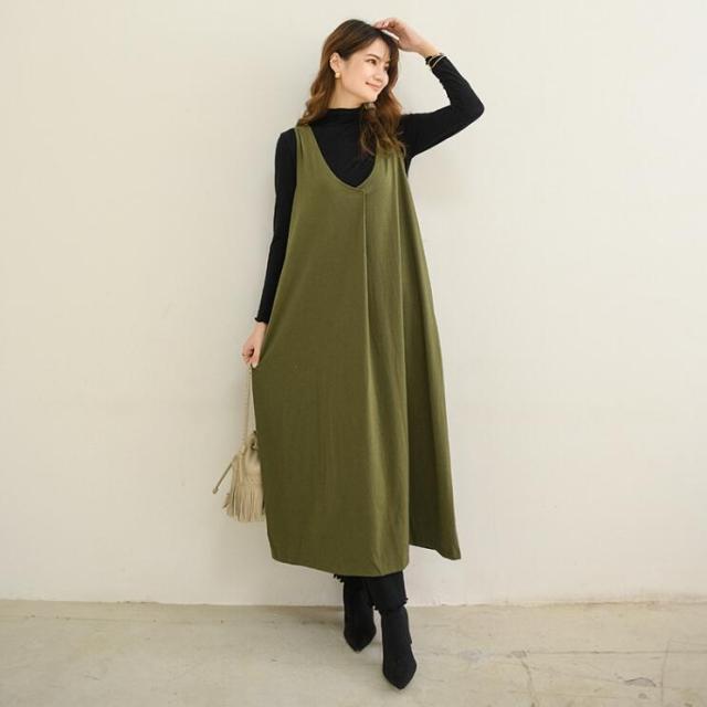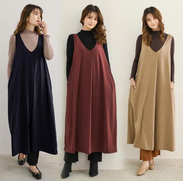 ナチュラル女子服 ママ 秋服 上品 重ね着キャミワンピ ロング ジャンパースカート vネック秋