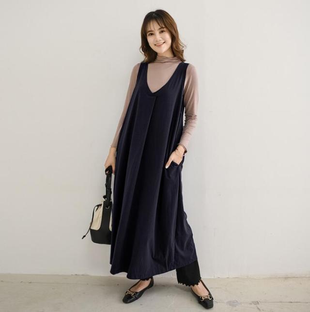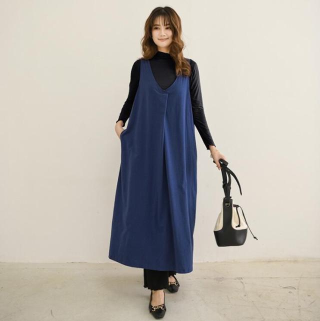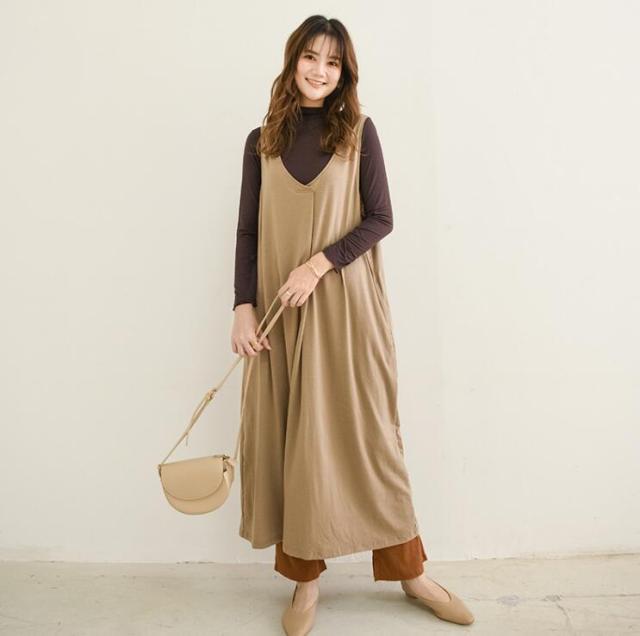 トップス問わず合わせるだけでレイヤードコーデを気軽にロングシーズン楽しめる袖なしワンピース