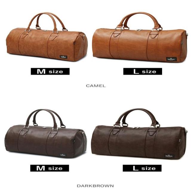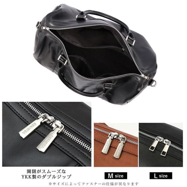 使用用途に合わせて選べる♪M、Lの2サイズ展開のボストンバッグが新登場。光沢のある滑らかな質感のPUレザーを採用。本革のような高品質な見た目なのに嬉しい軽量設計。メインルームは開閉しやすいダブルジップを採用。ファスナーが大きく開くので荷物の出し入れがしやすく中身の確認もしやすい。約1〜3泊分の荷物が入る大容量サイズで内側にはオープンポケット×1、ファスナー式ポケット×2を装備。バッグ外側の背面にはすぐに取り出したい小物の収納に便利なファスナーポケット付き。付属のショルダーストラップは取り外しと長さ調節が可能だから両手を空けたい時は肩掛けスタイルにチェンジ出来る。バッグの底面5箇所には、擦れや汚れを軽減する底鋲付きで安心。シンプルなデザインだから旅行用からタウンユースまでユニセックスで使えるアイテム。