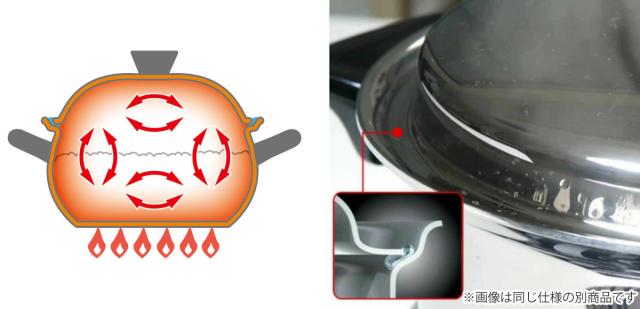 フタも本体も完全5層構造で、熱まわりがよく、鍋全体から熱が加わり熱ムラがない理想の対流を実現しました。また、フタの重みで旨みを閉じ込め、少量のごはんでもおいしく炊き上げます。