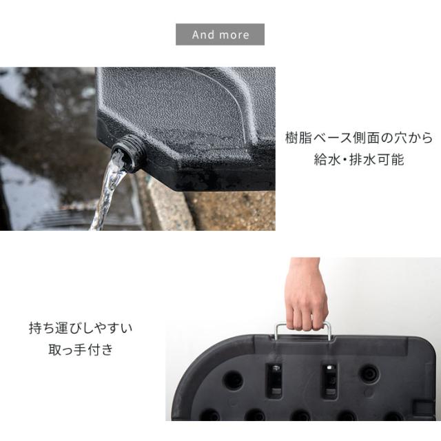 ※ベース(ウエイト)をスタンドのハネの部分に置くことで固定することができます。ベース(ウエイト)には水もしくは砂を満たしてご使用ください。