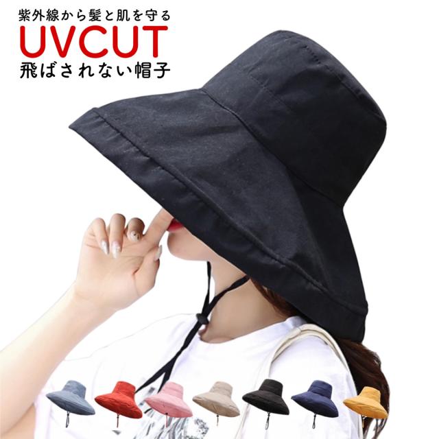 帽子 レディース 春 夏 秋 UVカット つば広 紫外線対策 小顔効果 顎紐 紐調整 飛ばされない ダメージケア