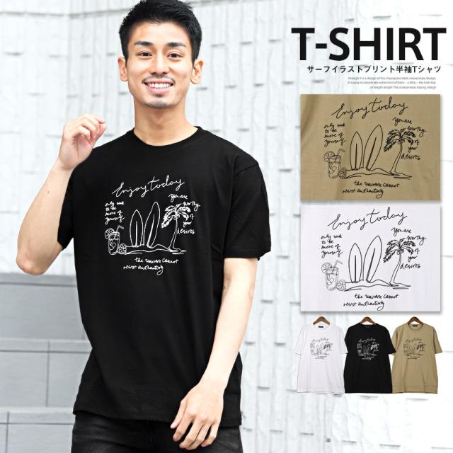 セール SALE 33%OFF Tシャツ メンズ 半袖 プリント イラスト パームツリー サーフボード ロゴ クルーネック【サーフイラストプリント半袖Tシャツ】 aa-1484