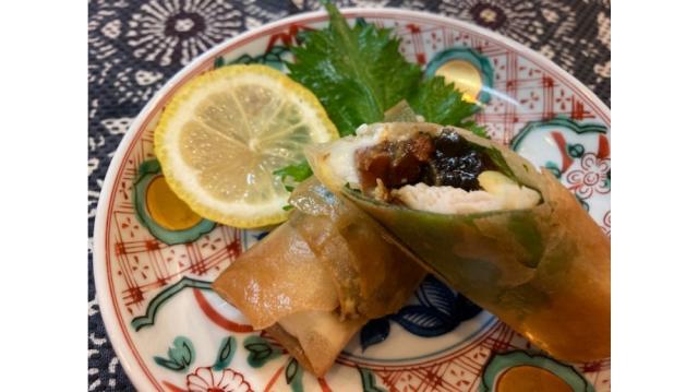 1.春巻きの皮に大葉→サラダチキン→エッグマヨネーズ→なんばんみそ→クリームチーズの順でのせます