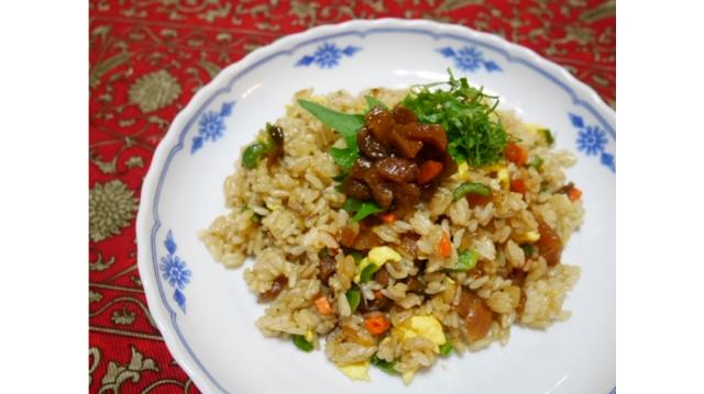 ご飯:茶碗1杯、玉ねぎ:小さめ1/2、人参:小さめ1/2、ピーマン:小さめ1個、卵:1個、大葉:1枚、豚小間切れ肉:65g、なんばんみそ:70g(約スプーン3杯)、油:適量、塩:適量
