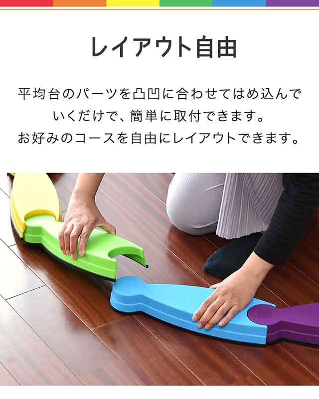 | 特記事項: ※不安定な置き方をしないでください。転倒してケガや破損の原因になります。 ※平均台がしっかりとつながれているか確認してからお使いください。使用中にガタついた場合はセットし直してください。 |