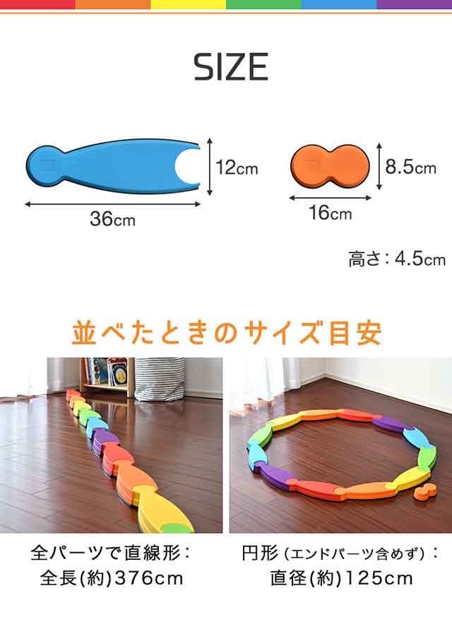 | サイズ: 平均台1パーツあたり:(約)36cmx12cmx4.5cm エンドパーツ:(約)16cmx8.5cmx4.5cm 収納時サイズ:(約)36cmx12cmx35.5cm |