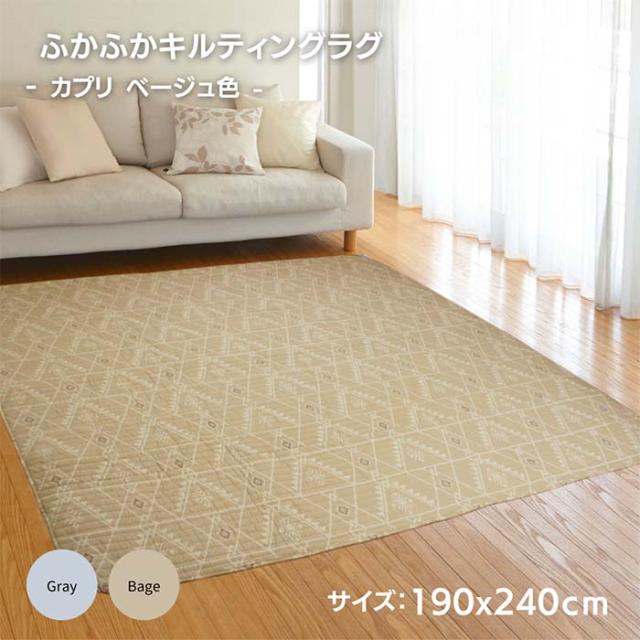 190x240cm 3畳用 北欧風キリム柄「カプリ」ベージュ色 さらさら肌触り ふっくらキルトラグ 丸洗いOK