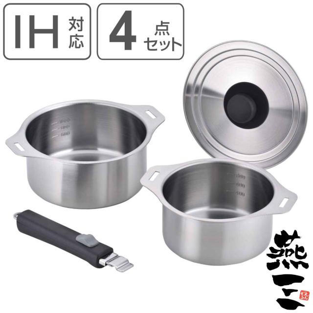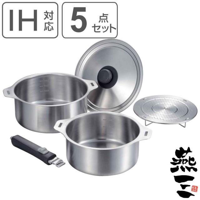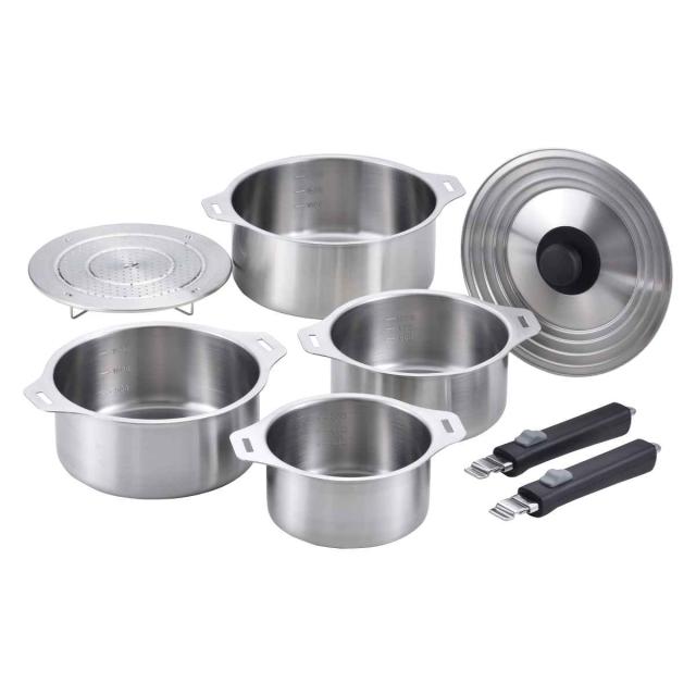 | 内容量 | 1セット (鍋14cm、鍋16cm、鍋18cm、鍋20cm、14・16・18・20cm兼用蓋、脱着ハンドル×2、蒸し台20cm用) |