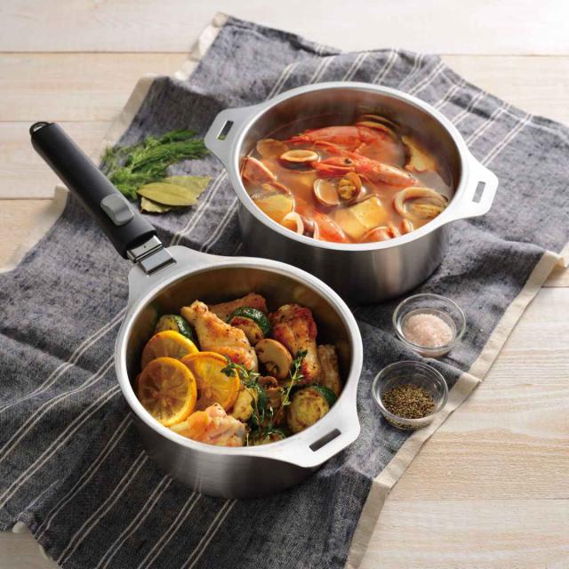 ハンドルが取り外しできる14、16、18、20cmの鍋、全ての鍋に使える兼用蓋、蒸し台20cm用、脱着ハンドル×2本のセットです。サビにくく、丈夫なステンレス製なので長くお使いいただけます。あたたかな表面加工に加え、安定感のあるデザインです。IH・ガス火両方に対応しています。