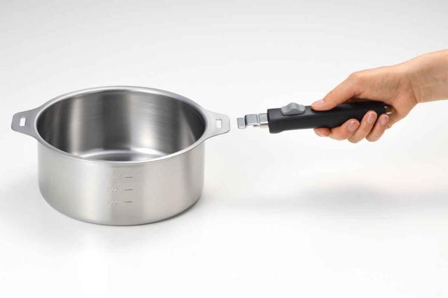 ハンドルは外すことができる脱着式です。ハンドルを外すと鍋を重ねて収納できるので、場所をとらず便利です。