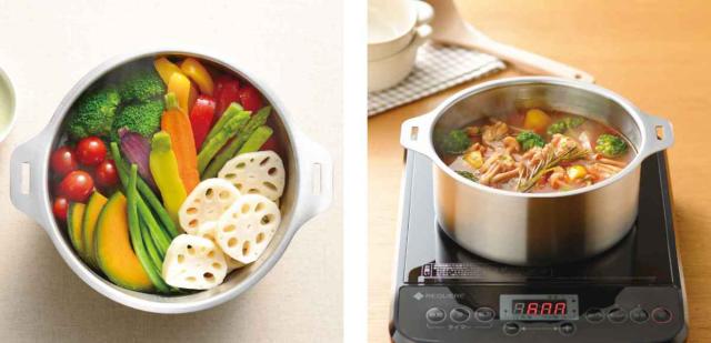 | 蒸し台で蒸し調理も簡単 蒸し台を鍋にセットして、茶碗蒸しや蒸し野菜などの蒸し料理ができます。栄養成分を逃がさず、素材の旨みや甘みを引き出してくれるのでヘルシーな仕上がりです。 | 卓上でも使いやすい ハンドルを外すことができるので、卓上でも使いやすいデザインです。アツアツの鍋やスープなどを卓上で楽しめます。 |