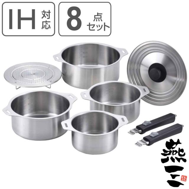 鍋8点セット IH対応 蓋付き 着脱式ハンドル2本付き 蒸し台付き 燕三 日本製 ( ガス火対応 8点セット 片手鍋 両手鍋 兼用蓋 蒸し皿 取っ手が取れる 燕三条 14cm 16cm 18cm 20cm ステンレス製 鍋セット ハンドル付き 新生活準備 )