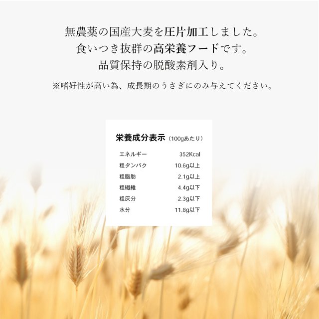 | 説明 | 無農薬の国産大麦を、圧片加工して食べやすくしました。 嗜好性が高く喰い付きが良いので与え過ぎにご注意ください。 成長期のうさぎにのみ与えてください。 無農薬の国産大麦を圧片加工しました。 食いつき抜群の高栄養フードです。 品質保持の脱酸素剤入り。 製造:日本 |