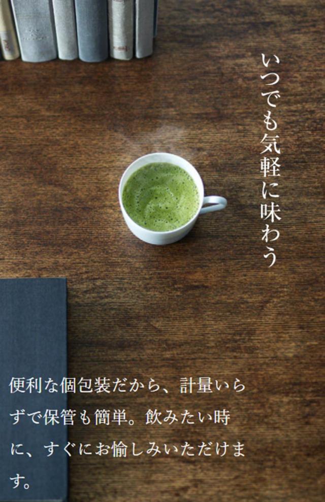 ●1杯1杯が個包装だから茶こしや急須いらずで、いつも新鮮な抹茶の香りと味わいをお楽しみいただけます。