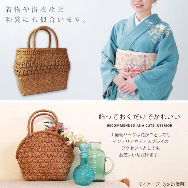 | 商品説明 | 天然山葡萄の蔓(つる)のバッグかごです。山に自生する山葡萄の蔓を贅沢に使用し、熟練の職人さんが手作りで編み上げています。 天然素材の丈夫で美しい一生もののバッグです。 使えば使うほど艶が出て美しく変化していく山葡萄かごバッグは「育てる」バッグです。 必要なものがしっかり収まる程よいサイズ感。自然素材の可愛いシルエットで、マチも十分にあるので普段使いに大活躍のファッションアイテムです。 季節を問わず通年使え、着物にもカジュアルにも似合います。 付属の内布は柿渋染めです。天然素材ならではの温かみのある色合いで、防腐、防虫効果に優れています。柿渋染めは使い込むほどに深みのある色へ変化していきます。 やさしい風合いが山葡萄バックに相性がよろしいです。 お手元に届きましたら、毎日、バッグを手で撫でてあげてください。 山葡萄の皮は油分を吸収する特徴がある為、撫でてあげると手の油を吸収し、ゆっくりとアメ色に変化し光沢が増していきます。 時間とともに自分色に染まるようで、とても愛着が沸きます。変化の時間もお楽しみいただけます。 これを「山葡萄バッグを育てていく」と言いますが、同じバッグでも育て具合で色合いに差が出てくるので世界で一つしかないバッグになります。 <山葡萄バッグができるまで> ・蔓の採取 山葡萄の蔓から取った皮を使い、熟練の職人が丹精込めてひとつひとつ作っています。 人里離れた標高1,000m以上の山奥で昔から寒冷地に自生する植物です。 蔓と言っても太さ10cm以上にもなります。 その蔓を剥ぎ取り乾燥させて、かごバッグの材料となるようサイズを整えていきます。 ・編む 職人が作った木型に合わせて、バッグの底部から編んでいきます。 網目が均等にするには指先の力が強くないと綺麗に仕上げることができません。 最後に細かい毛羽を丁寧に取り除き、かごバッグのできあがりです。 ・技術 丁寧に編み上げられた山葡萄かご編みは、熟練の職人が何日もかけて作り上げていくので大量生産ができず稀少性が高いです。 その為、市場に出回る数も限られています。 ・内布を取り付け ナチュラルでおしゃれな柿渋染めの内布が付いています。天然の柿渋原液を使用し染め上げています。 優しい風合いが山葡萄バックに相性がよろしいです。 内布は縫い付けて固定されていますので、安定した収納ができバッグの中身も安心です。 ・柿渋染めの理由 柿渋には防虫、防カビ、防腐、防臭、消臭などの効果があります。 山葡萄の蔓は正常にご使用、保管していただけば、カビが生えることはありませんが、湿気が多いところで保管すると表面にカビが発生する場合があります。 それを予防目的も兼ねてコストを掛けてでも、山葡萄バッグに柿渋染めの内布を取り付けています。 <山葡萄かごバッグの選び方> 初めて憧れの山葡萄バッグを持つ方は、定番の「網代編み」がとても人気です。 2個目、3個目を購入する方は「六角花編み」や「サイズ違い」をお選びいただく場合が多いです。 山葡萄チャームやお財布もございます。 職人が丁寧に編み上げた籠バッグは世代を超え永く愛することができます。 年月を重ねるほど深みを増す色合いと艶を楽しめる山葡萄シリーズは、母の日や誕生日プレゼントなどの贈り物としても大変喜ばれる逸品です。 長年、時間を共にしたバッグはなんとも言えない艶に輝き、しなやかさも合わせ持ち、手放せないものになる一生ものです。 編み方がおしゃれな山葡萄バッグは花かごとしてもインテリアやディスプレイのアクセントとしてもお使いいただけます。 自然素材をお楽しみください 天然素材を使用し、すべて手編みで手作り品の為、サイズ・重量ともに若干の個体差が生じます。 自然素材特有のささくれ、割れ、色ムラが生じる場合がございます。 ささくれや色ムラ等は、使い込むうちに自然と馴染み、風合いよくなめらかになっていきます。 天然素材を使用している為、予めご理解、ご了承いただき自然の風合いをお楽しみいただければ幸甚です。 |