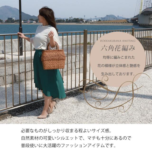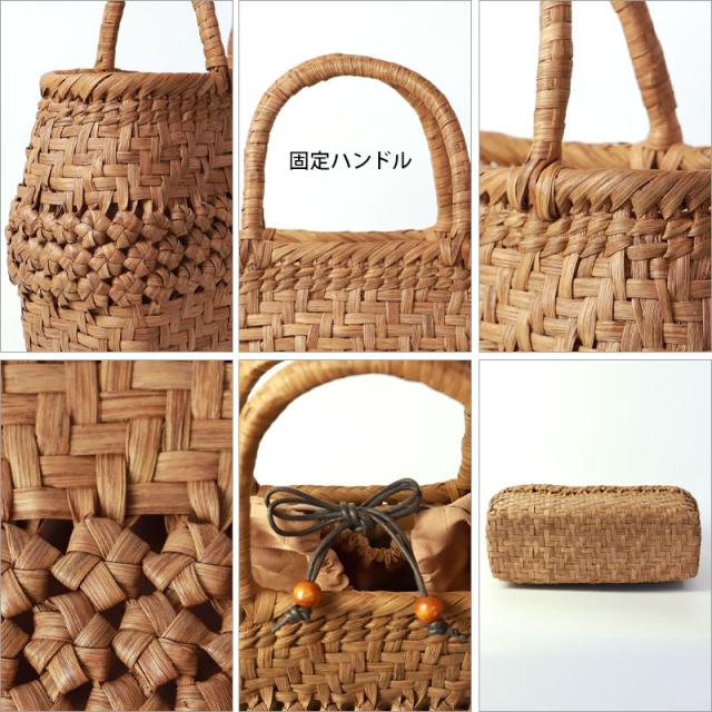 | 仕様 | 網代六角花編み 固定ハンドル 柿渋染め内布(巾着タイプ 内ポケット付き) 取り扱い説明書 保証書付き |