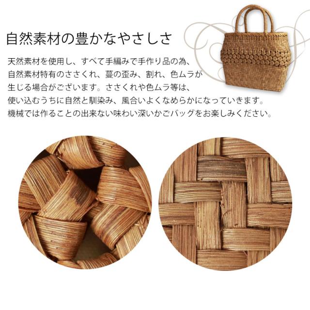 | ご購入に関するご注意 | ・天然素材を使用し、すべて手編みで手作り品の為、サイズ・重量ともに若干の個体差が生じます。 また、自然素材特有のささくれ、蔓の歪み、割れ、色ムラが生じる場合がございます。 ささくれや色ムラ等は、使い込むうちに自然と馴染み、風合いよくなめらかになっていきます。 ・内布もまた天然素材での染めのため、多少色味に違いが生じる場合がございます。 天然素材を使用している為、予めご理解、ご了承いただき自然の風合いをお楽しみいただければ幸甚です。 ・モニター・ディスプレイによっても写り方が変ります。 予めご了承くださいませ。 |