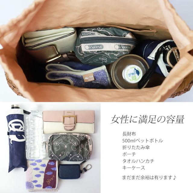 必要なものがしっかり収まる程よいサイズ感。自然素材の可愛いシルエットで、マチも十分にあるので普段使いに大活躍のファッションアイテムです。