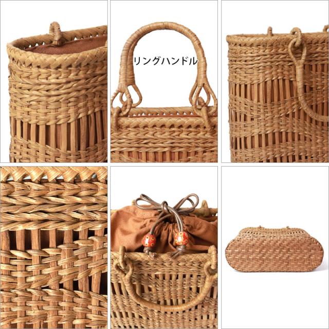 | 仕様 | 透かし波編み リングハンドル 柿渋染め内布(巾着タイプ 内ポケット付き) 取り扱い説明書 保証書付き |