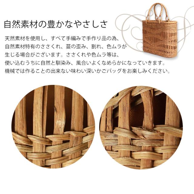 | ご購入に関するご注意 | ・天然素材を使用し、すべて手編みで手作り品の為、サイズ・重量ともに若干の個体差が生じます。 また、自然素材特有のささくれ、蔓の歪み、割れ、色ムラが生じる場合がございます。 ささくれや色ムラ等は、使い込むうちに自然と馴染み、風合いよくなめらかになっていきます。 ・内布もまた天然素材での染めのため、多少色味に違いが生じる場合がございます。 天然素材を使用している為、予めご理解、ご了承いただき自然の風合いをお楽しみいただければ幸甚です。 ・モニター・ディスプレイによっても写り方が変ります。 予めご了承くださいませ。 |
