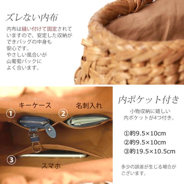| 素材 | 鞄本体:天然山葡萄蔓 内布:綿100%(柿渋染め) |