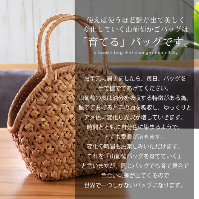 | 商品説明 | 天然山葡萄の蔓(つる)のバッグかごです。山に自生する山葡萄の蔓を贅沢に使用し、熟練の職人さんが手作りで編み上げています。 天然素材の丈夫で美しい一生もののバッグです。 使えば使うほど艶が出て美しく変化していく山葡萄かごバッグは「育てる」バッグです。 必要なものがしっかり収まる程よいサイズ感。自然素材の可愛いシルエットで、マチも十分にあるので普段使いに大活躍のファッションアイテムです。 季節を問わず通年使え、着物にもカジュアルにも似合います。 付属の内布は柿渋染めです。天然素材ならではの温かみのある色合いで、防腐、防虫効果に優れています。柿渋染めは使い込むほどに深みのある色へ変化していきます。 やさしい風合いが山葡萄バックに相性がよろしいです。 お手元に届きましたら、毎日、バッグを手で撫でてあげてください。 山葡萄の皮は油分を吸収する特徴がある為、撫でてあげると手の油を吸収し、ゆっくりとアメ色に変化し光沢が増していきます。 時間とともに自分色に染まるようで、とても愛着が沸きます。変化の時間もお楽しみいただけます。 これを「山葡萄バッグを育てていく」と言いますが、同じバッグでも育て具合で色合いに差が出てくるので世界で一つしかないバッグになります。 <山葡萄バッグができるまで> ・蔓の採取 山葡萄の蔓から取った皮を使い、熟練の職人が丹精込めてひとつひとつ作っています。 人里離れた標高1,000m以上の山奥で昔から寒冷地に自生する植物です。 蔓と言っても太さ10cm以上にもなります。 その蔓を剥ぎ取り乾燥させて、かごバッグの材料となるようサイズを整えていきます。 ・編む 職人が作った木型に合わせて、バッグの底部から編んでいきます。 網目が均等にするには指先の力が強くないと綺麗に仕上げることができません。 最後に細かい毛羽を丁寧に取り除き、かごバッグのできあがりです。 ・技術 丁寧に編み上げられた山葡萄かご編みは、熟練の職人が何日もかけて作り上げていくので大量生産ができず稀少性が高いです。 その為、市場に出回る数も限られています。 ・内布を取り付け ナチュラルでおしゃれな柿渋染めの内布が付いています。天然の柿渋原液を使用し染め上げています。 優しい風合いが山葡萄バックに相性がよろしいです。 内布は縫い付けて固定されていますので、安定した収納ができバッグの中身も安心です。 ・柿渋染めの理由 柿渋には防虫、防カビ、防腐、防臭、消臭などの効果があります。 山葡萄の蔓は正常にご使用、保管していただけば、カビが生えることはありませんが、湿気が多いところで保管すると表面にカビが発生する場合があります。 それを予防目的も兼ねてコストを掛けてでも、山葡萄バッグに柿渋染めの内布を取り付けています。 <山葡萄かごバッグの選び方> 初めて憧れの山葡萄バッグを持つ方は、定番の「網代編み」がとても人気です。 2個目、3個目を購入する方は「六角花編み」や「サイズ違い」をお選びいただく場合が多いです。 山葡萄チャームやお財布もございます。 職人が丁寧に編み上げた籠バッグは世代を超え永く愛することができます。 年月を重ねるほど深みを増す色合いと艶を楽しめる山葡萄シリーズは、母の日や誕生日プレゼントなどの贈り物としても大変喜ばれる逸品です。 長年、時間を共にしたバッグはなんとも言えない艶に輝き、しなやかさも合わせ持ち、手放せないものになる一生ものです。 編み方がおしゃれな山葡萄バッグは花かごとしてもインテリアやディスプレイのアクセントとしてもお使いいただけます。 自然素材をお楽しみください 天然素材を使用し、すべて手編みで手作り品の為、サイズ・重量ともに若干の個体差が生じます。 自然素材特有のささくれ、割れ、色ムラが生じる場合がございます。 ささくれや色ムラ等は、使い込むうちに自然と馴染み、風合いよくなめらかになっていきます。 天然素材を使用している為、予めご理解、ご了承いただき自然の風合いをお楽しみいただければ幸甚です。 |